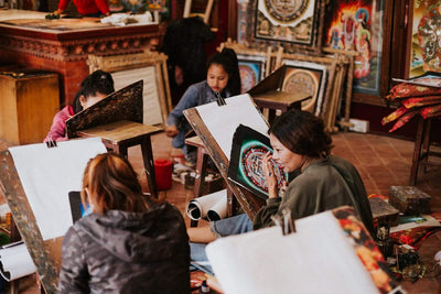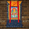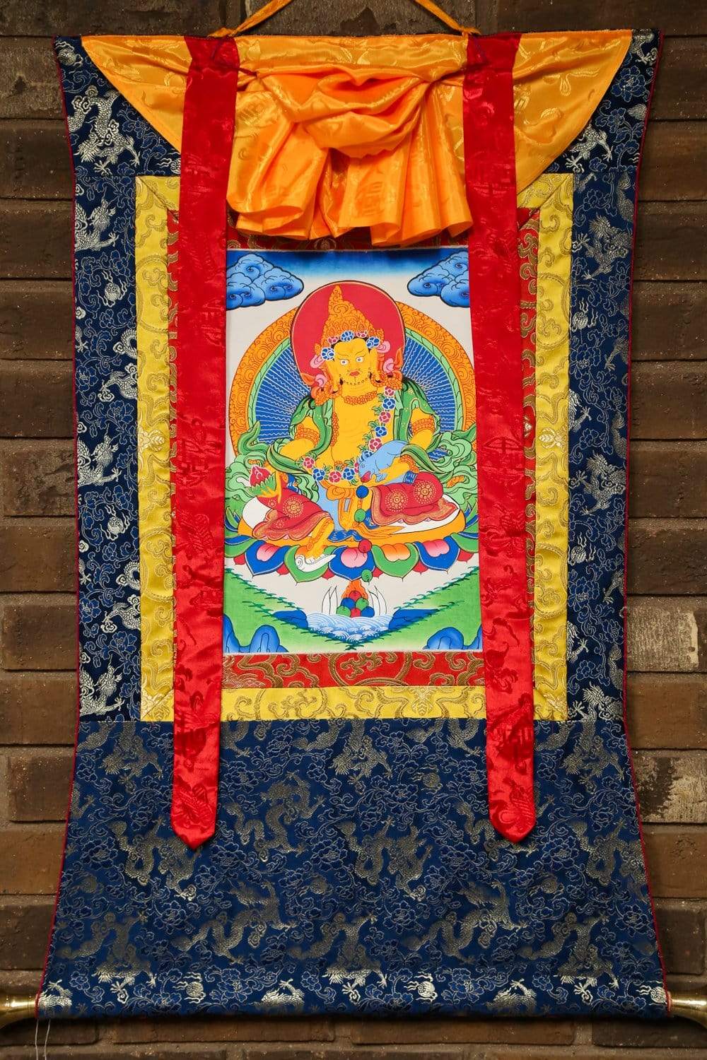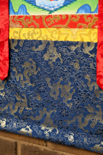 The traditional Tibetan brocade fabric is a polyester and silk blend, making it a long-lasting and versatile material. The deep blue brocade features intricate golden dragon designs with red and yellow framing around the painting.