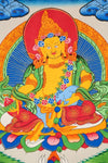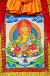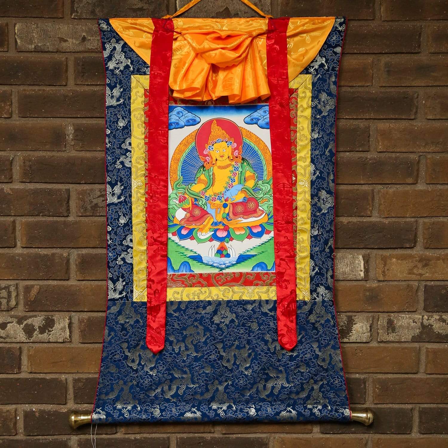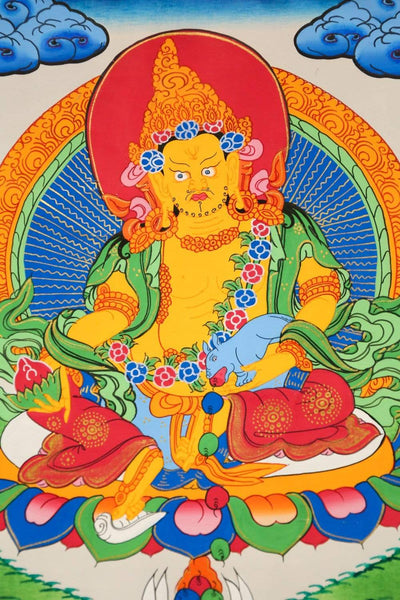 Jambhala is known as the Buddhist god of wealth. He is a Bodhisattva of material and spiritual wealth as well as many other things, especially of granting financial stability. Yellow Jambhala is considered the most powerful of the wealth gods. He is seen sitting on a lotus flower with a mongoose in one hand that spits jewels from its mouth, and he holds fruit in the other.